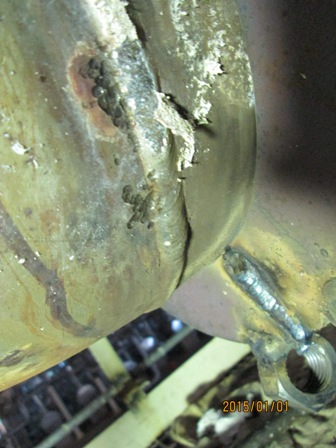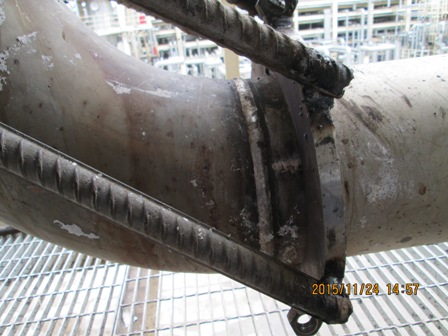 雙翼公司的這個(gè)漏點(diǎn)出現(xiàn)在焊縫的熱影響區(qū),內(nèi)部介質(zhì)為氫氣占60%以上,還有大約10%的一氧化碳,壓力約2兆帕,在大約三分之一的圓周面上出現(xiàn)了7個(gè)漏點(diǎn),我們和甲方一致認(rèn)為:這個(gè)缺陷非常危險(xiǎn),必須首先進(jìn)行加強(qiáng),然后用金屬擠壓法進(jìn)行堵漏,經(jīng)過大半天的努力,達(dá)到了預(yù)期的效果。